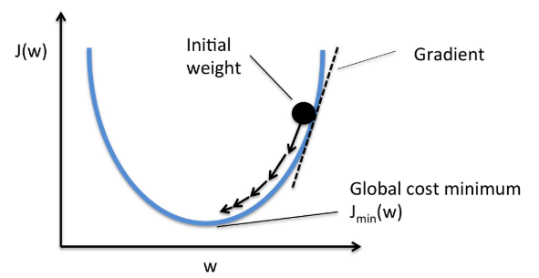$\quad\rightarrow$ 경사하강범 (Gradient Descent): 초기 W값을 넣고 global cost minimum으로 내리는 것 (미분)
