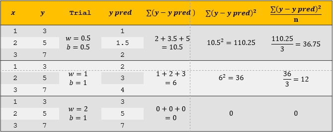 - 가지고있는 x와 y의 값을 기준으로 다양한 trial을 통해 W와 b를 예측한다