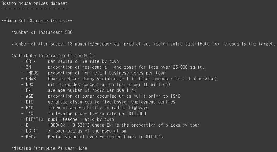 - MEDV: 자가 주택의 중앙값 (1,000 달러 단위)