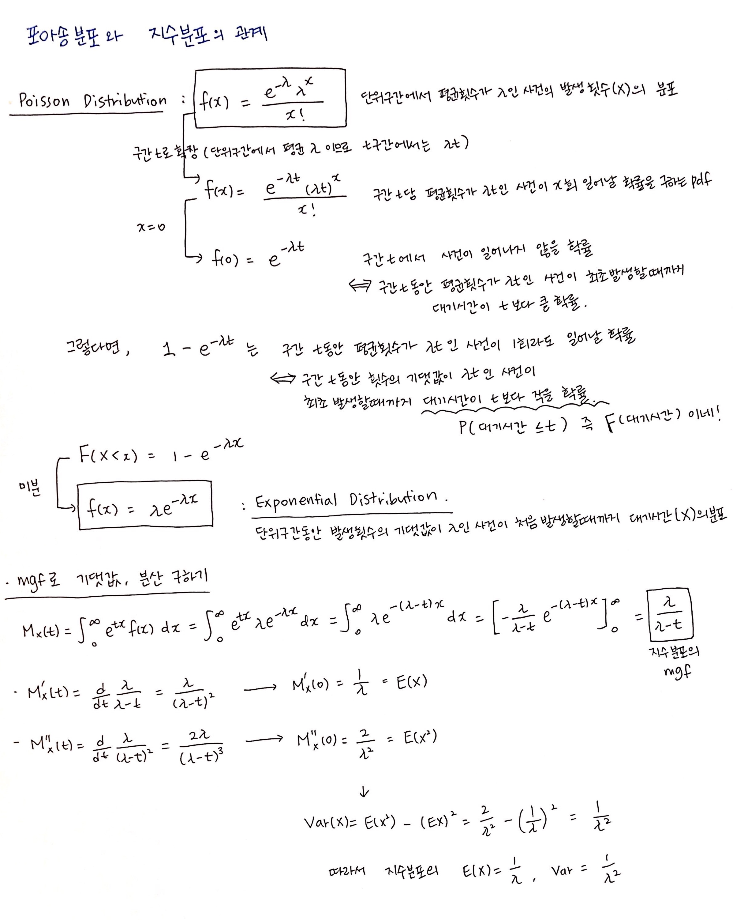아래 포아송 분포에서 지수 분포를 유도하는 과정과 지수분포의 기댓값과 분산을 설명해놓았다.